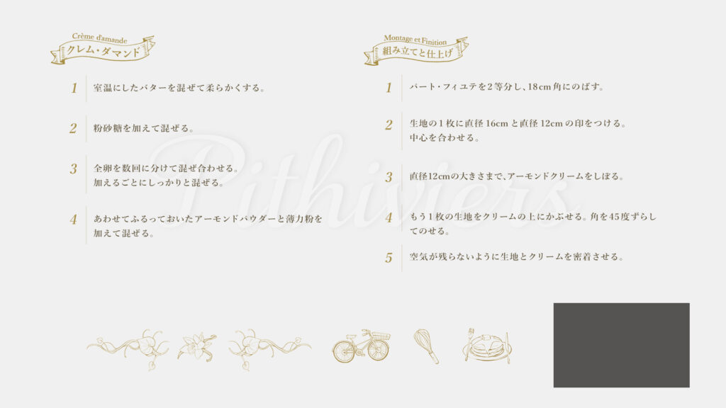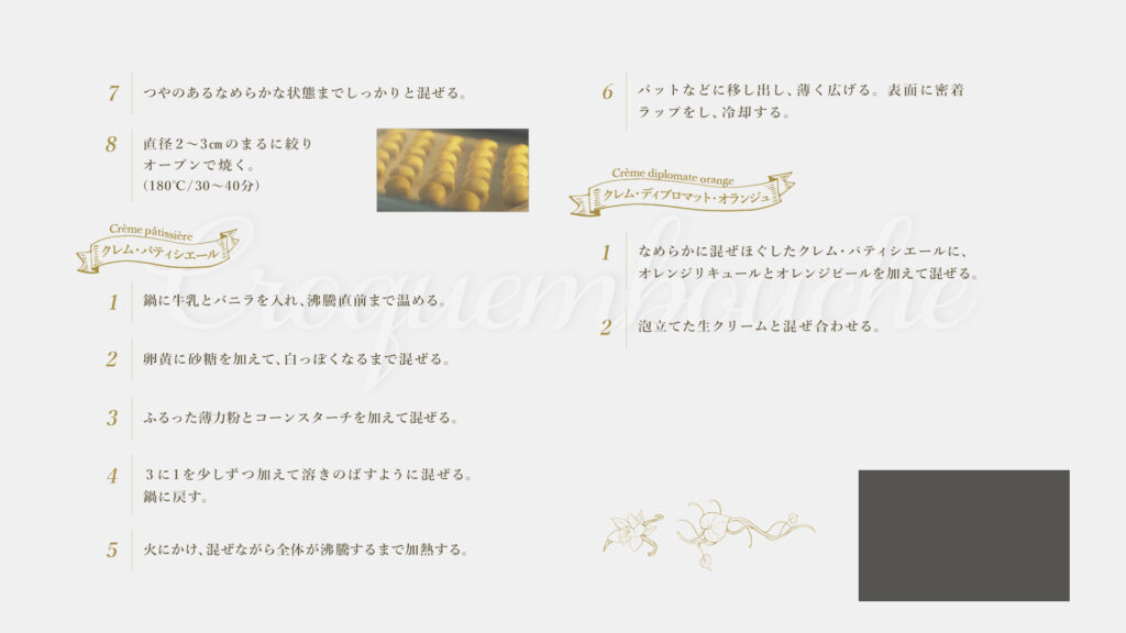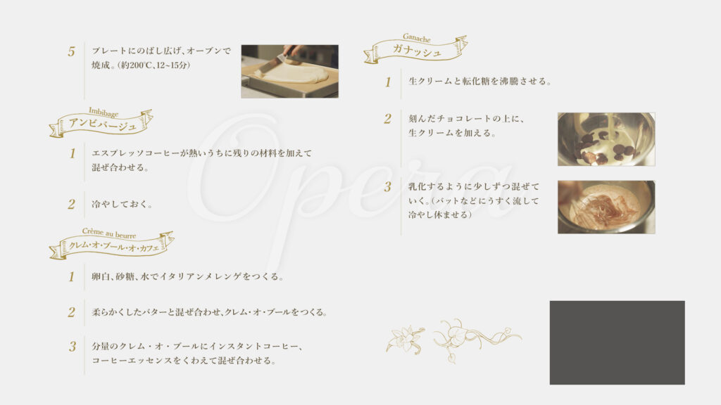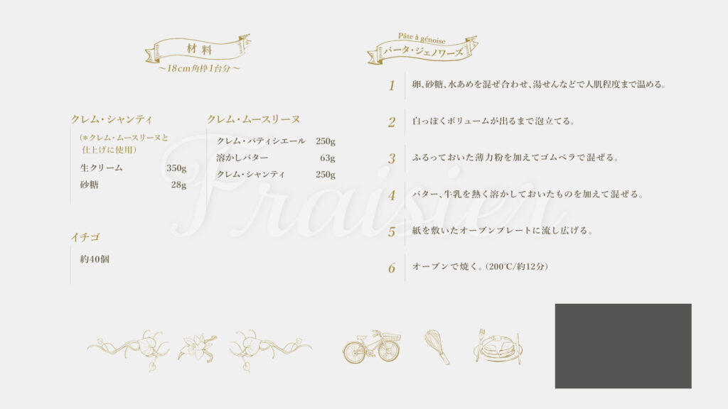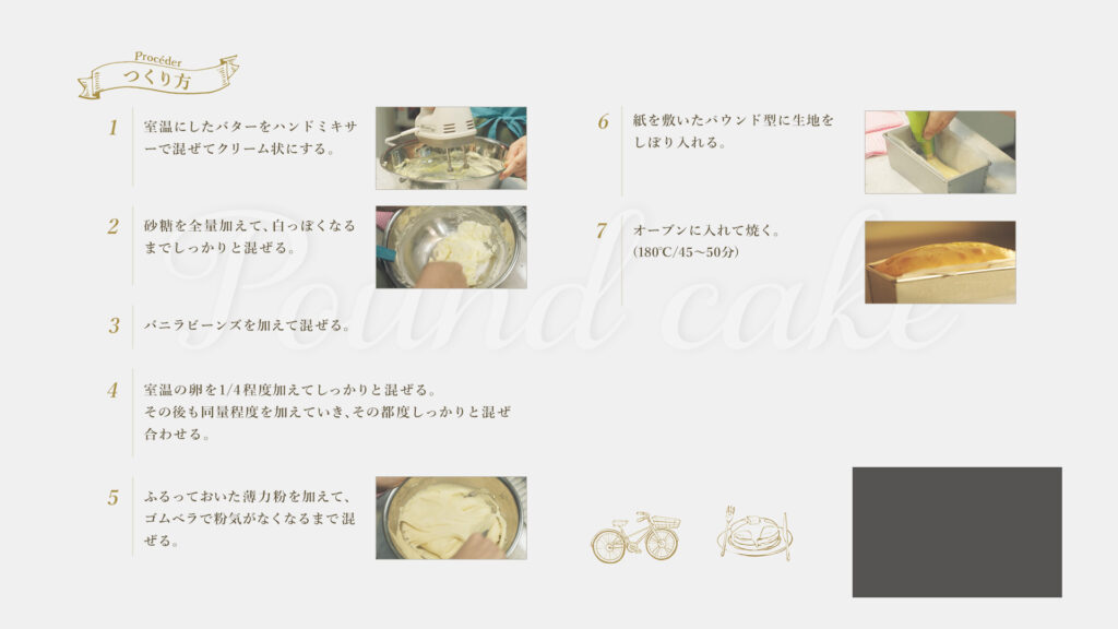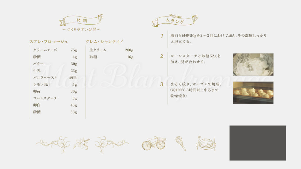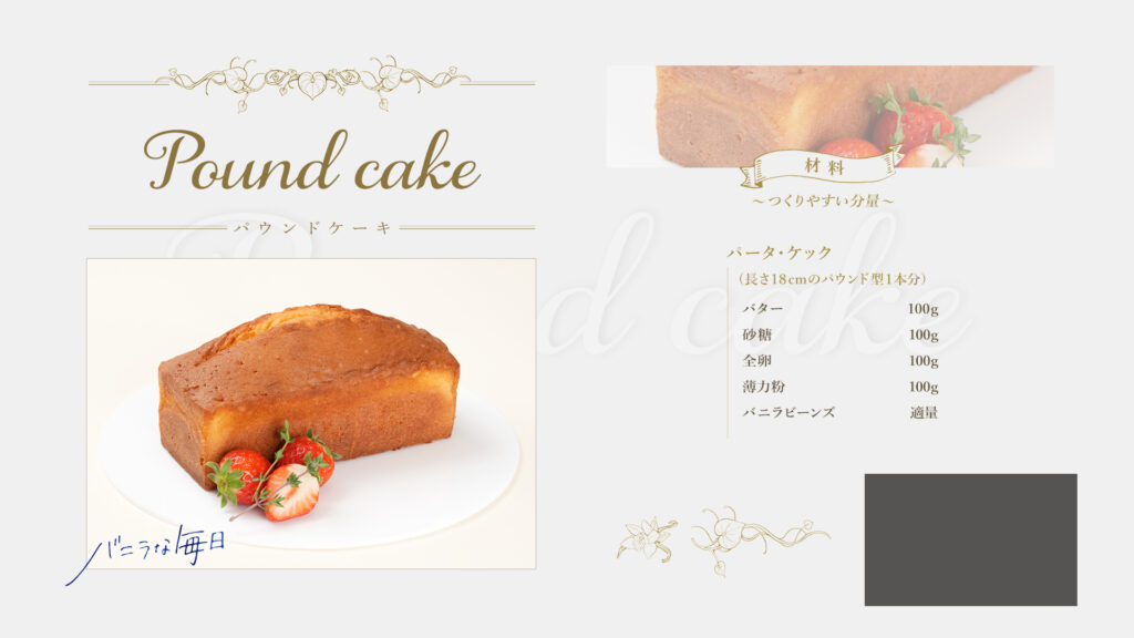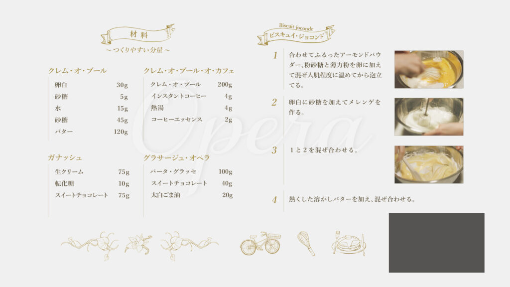 国内ドラマの「レシピ」を、Blu-rayメニューとして作成するデザイン制作です。クライアントの意向として、今回の商品はブルーレイ専用ケース仕様になり、お菓子レシピをブックレットとして作成したかったが、サイズが小さく、ブックレットにレシピを入れるのが厳しかったため、メニュー画面へ特典扱いとして静止画で入れたい。